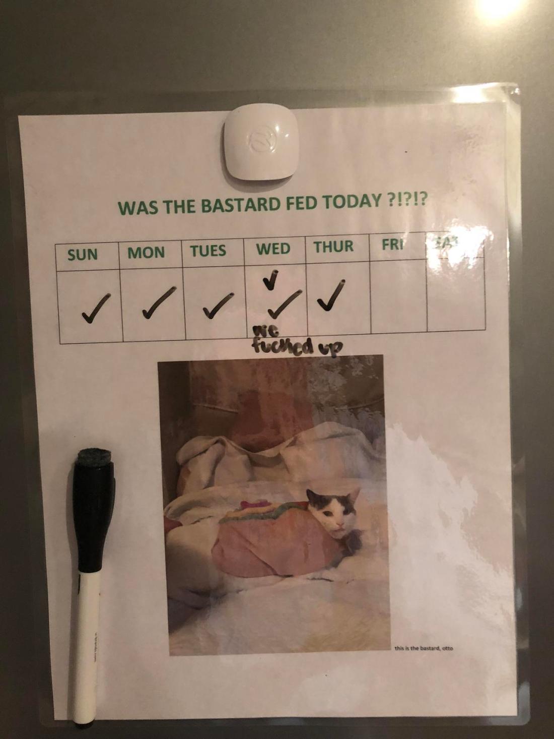 Our cat had all four roommates feeding him each day because he acted like he was starving and we didn’t know that the other roommate already fed him. This was our solution, hopefully he will slim down a bit.