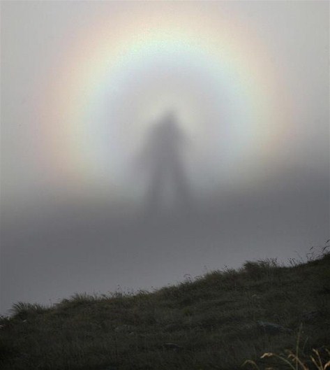 A rare optic phenomenon, the “Brocken spectre,” which occurs when a person stands at a higher altitude in the mountains and sees his shadow cast on a cloud at a lower altitude, Tatra Mountains,Poland. Via FB