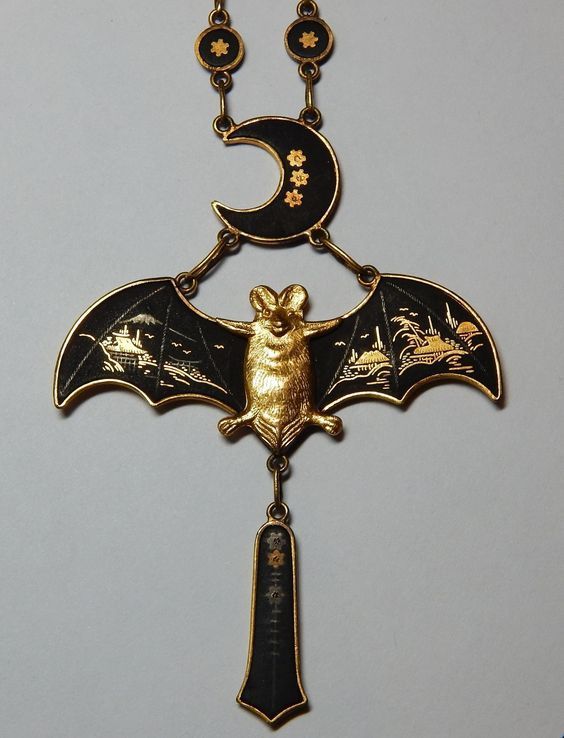Art Nouveau Japanese 24K; Silver Inlaid Damascene Bat and Crescent Moon Necklace
